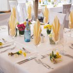 W przypadku rozsadzenia gości przy małych, na przykład okrągłych stolikach, kandelabry ze świecami lub bukietami kwiatów mogą znajdować się na każdym z nich.